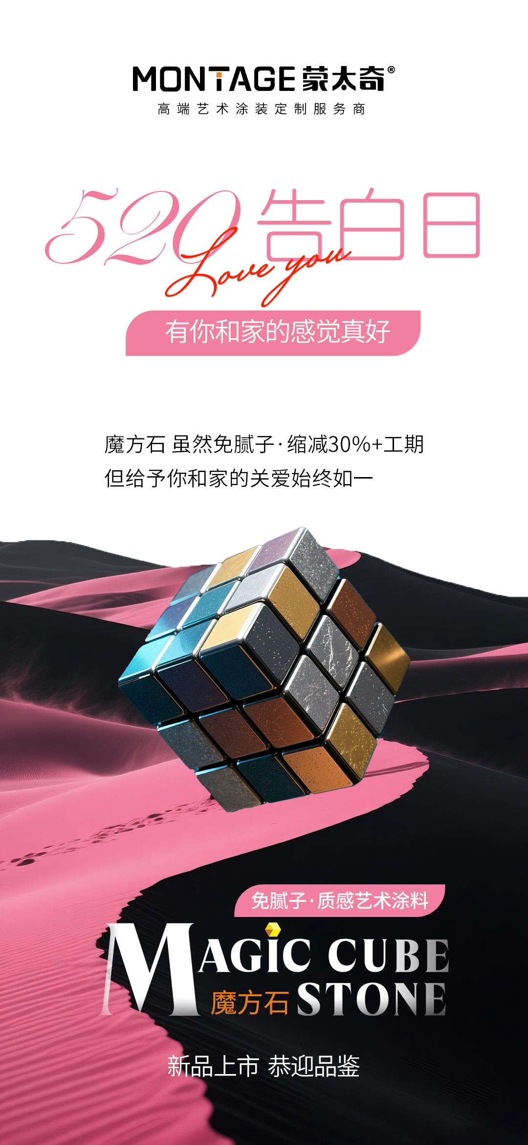 520 告白日是對所有「愛」的溫柔回應 —— 愛家人的三餐四季,愛自己的棲居理想,愛生活的細水長流。而家,作為承載愛的容器,每一寸墻面都是情感的底色。蒙太奇魔方石藝術漆讓墻面不是冰冷的屏障,而是愛家的情緒表達,用驚艷72面+,打磨出365天的溫柔守護。