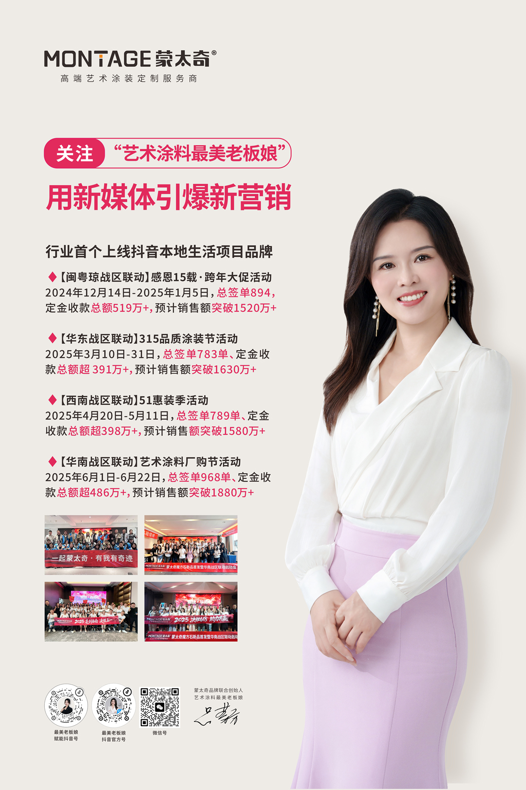 2024年到2025年,蒙太奇聯合創始人、“藝術涂料最美老板娘”呂芳方跨越2個年度,構建起覆蓋全國五大戰區的賦能版圖,以“區域聯動活動啟動會,區域金牌涂裝特訓營,區域聯動活動簽單,單店活動爆破,老板娘巡店之旅”五大核心策略,以破局之勢重塑行業增長范式。