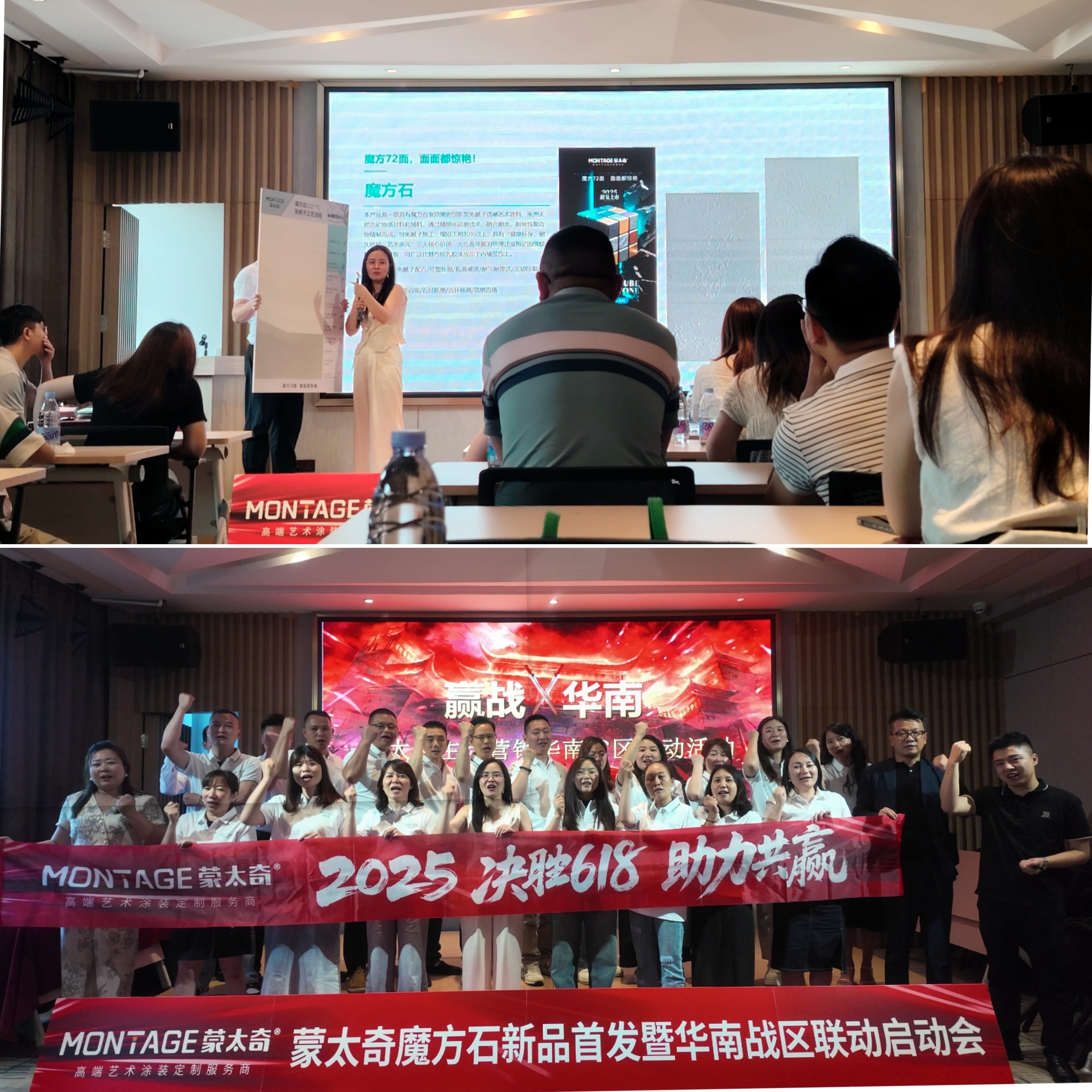 5月底至6月初,呂芳方女士攜蒙太奇2025年度戰略新品「魔方石」來到華南戰區。在廣東番禺和江西南昌兩地,分別啟動618華南聯動同城流量特訓營。她親自揭曉這款「免膩子工藝+ 72 面百變效果」的革命性產品,并同步推出「新品突圍 + 流量破局」雙主線戰術。