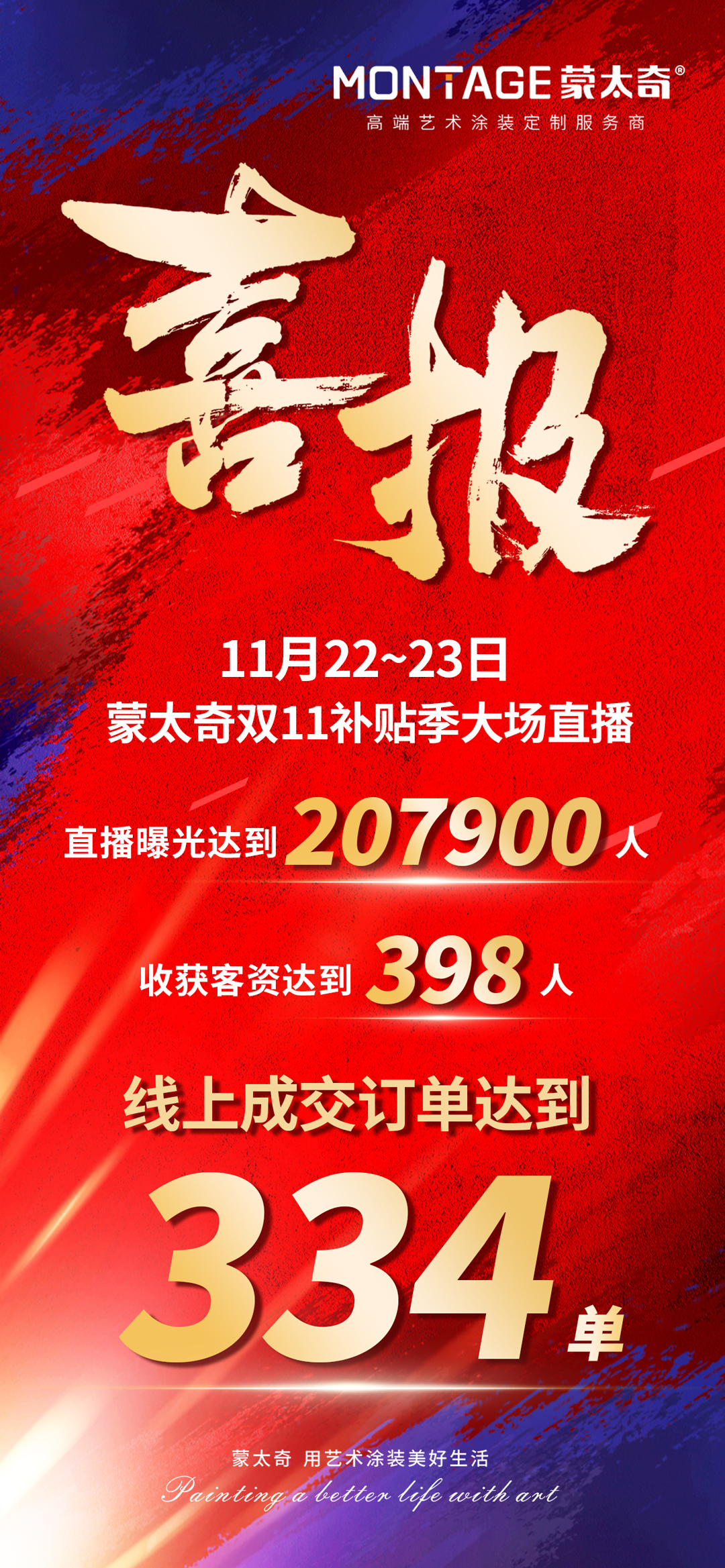 11月22日至23日晚18:30-22:30,蒙太奇舉行了兩場抖音本地生活雙11返場大場直播,人氣爆棚。兩場直播累計收獲20.79萬曝光,398條客資,線上成交訂單334單,展現(xiàn)出蒙太奇強(qiáng)勁的品牌實力和市場影響力。